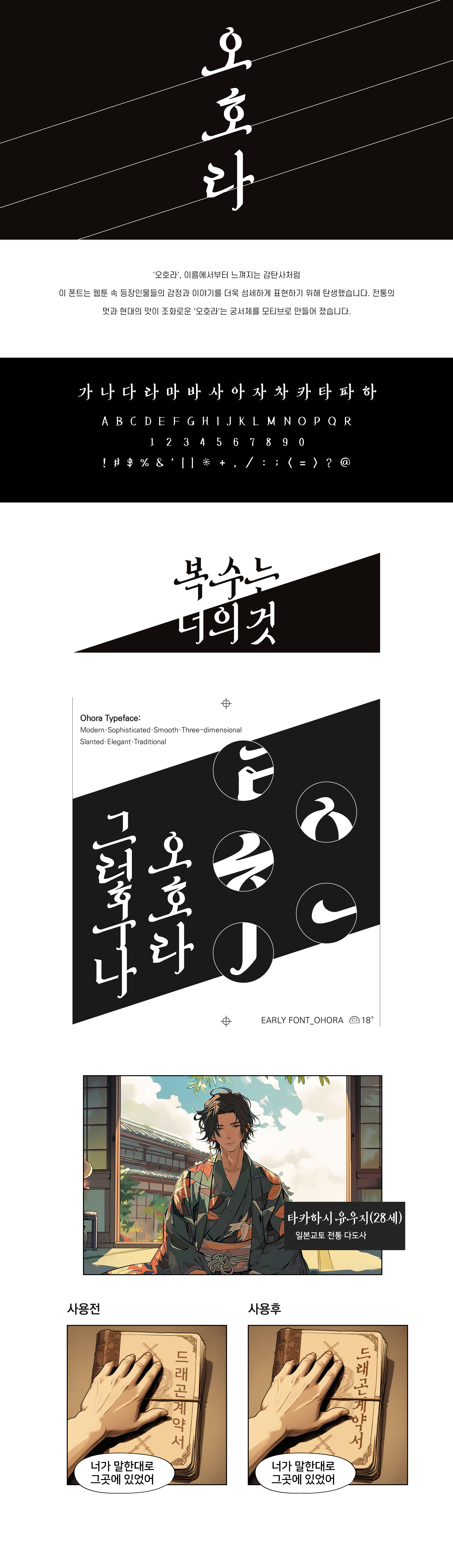 '오호라', 이름에서부터 느껴지는 감탄사처럼 이 폰트는 웹툰 속 등장인물들의 감정과 이야기를 더욱 섬세하게 표현하기 위해 탄생했습니다. 전통의 멋과 현대의 맛이 조화로운 '오호라'는 궁서체를 모티브로 만들어 졌습니다.